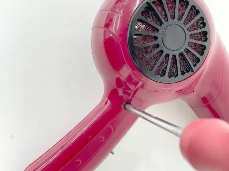 먼지나 머리카락이 껴 있는 것이 보인다면, 드라이어의 나사를 풀어 조심스럽게 위/아래로 분리합니다.