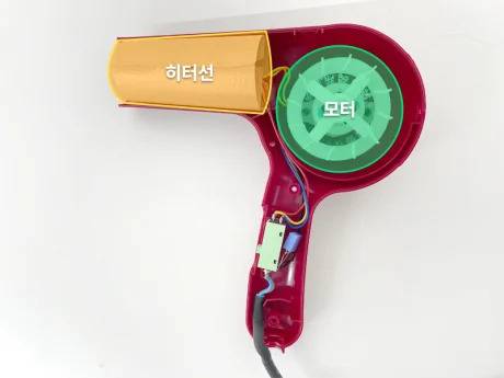 헤어드라이어 구조를 살펴보면, 드라이기 앞쪽에는 히터 선이 있고, 안쪽에는 모터가 있어 바람을 내보냅니다.
