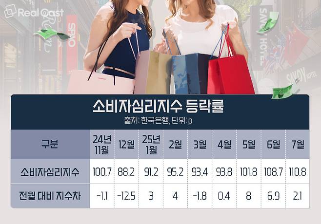 지난 23일 한국은행이 발표한 7월 소비자동향조사 결과에 따르면 소비자심리지수는 110.8로 전월과 비교해 2.1p 오른 것으로 확인됐습니다. 이는 2021년 6월(111.1) 이후 4년 1개월 만의 최고치입니다.
