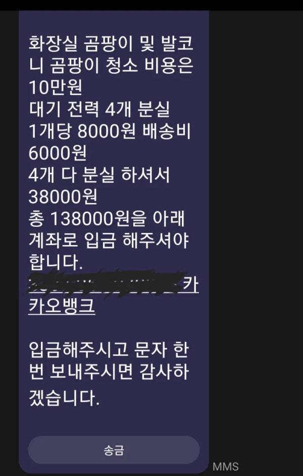 A씨는 “정신이 없는 와중에 입금을 진행하긴 했지만, 계좌주 이름이 LH와 관계없는 개인 이름이었던 부분이 마음에 걸려 이후 LH 홈페이지에 민원을 올렸다”면서 “민원담당자에게 연락을 받은 결과, 어떠한 경우라도 개인 통장으로 입금을 받는 경우는 없다는 답변을 받았고, 부품 비용을 제한 청소 비용은 다시 돌려받을 수 있었다”고 했다.