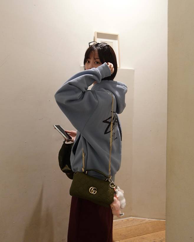 첫 번째 룩에서 그는 파스텔 톤의 스카이 블루 컬러 후드 티셔츠를 착용해 편안하면서도 스타일리시한 감각을 뽐냈다. 등판에 새겨진 큼직한 그래픽 레터링이 스트릿 감성을 더하며, 넉넉한 오버핏 실루엣이 여유로운 분위기를 자아낸다. 특히 골드 로고 장식이 돋보이는 딥 그린 컬러의 미니 체인 백을 숄더로 착용하고, 가방에는 귀여운 퍼 키링을 달아 키치한 포인트를 주었다. 머리 위에 무심하게 걸친 안경은 자연스러운 꾸안꾸(꾸민 듯 안 꾸민 듯) 룩의 정석을 보여준다.