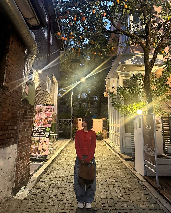 어둠이 내려앉은 거리에서 포착된 그는 비비드한 레드 컬러의 카디건을 활용해 시선을 사로잡았다. 단추를 모두 잠가 단정한 톱처럼 연출한 카디건은 그의 흰 피부를 더욱 돋보이게 만든다. 하의로는 독특한 패턴이 들어간 와이드 핏의 데님 팬츠를 매치해 힙한 분위기를 연출했다. 넉넉한 바지 핏은 상의의 핏한 느낌과 대비를 이루며 전체적인 실루엣의 균형을 잡았다. 손에 든 브라운 컬러의 스웨이드 백은 빈티지한 매력을 더하며 전체적인 룩에 따뜻한 감성을 불어넣었다.