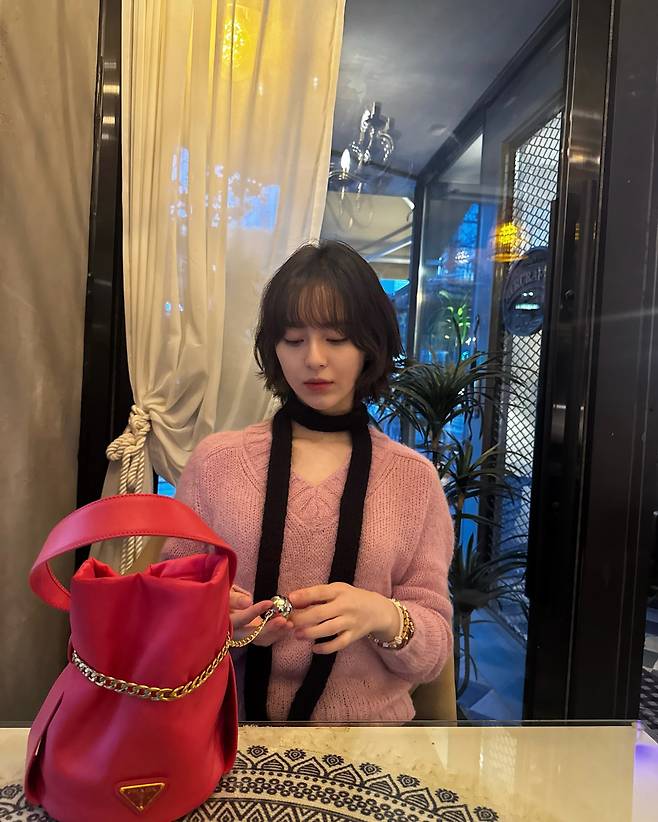 실내에서 촬영된 이 사진 속에서는 포근한 질감이 느껴지는 베이비 핑크 컬러의 브이넥 니트를 착용해 사랑스러운 매력을 극대화했다. 목에는 얇고 긴 블랙 스키니 스카프를 두 번 감아 늘어뜨려 자칫 밋밋할 수 있는 네크라인에 세련된 포인트를 주었다. 테이블 위에는 골드 체인 스트랩이 달린 강렬한 레드 컬러의 버킷 백이 놓여 있어 룩에 생기를 더한다. 손목에 착용한 볼드한 골드 브레이슬릿과 반지는 페미닌한 무드를 한층 고조시키는 액세서리 활용법을 보여준다.