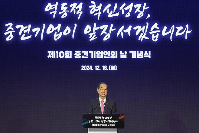 [한덕수 대통령 권한대행 국무총리가 16일 서울 더 플라자 호텔에서 열린 제10회 중견기업인의 날 기념식에서 축사하고 있다. (사진=연합뉴스)]