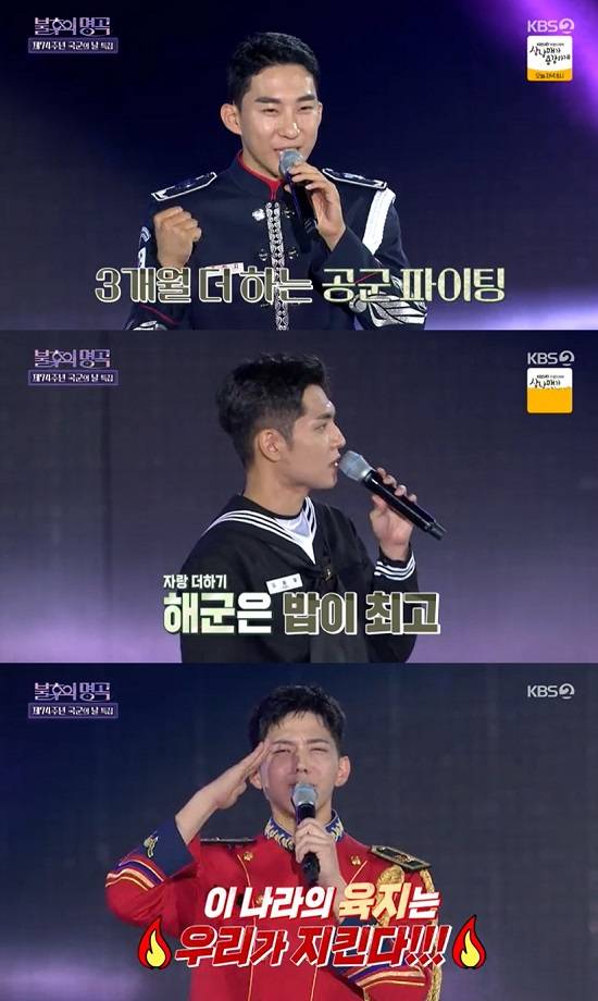 이날 육군, 해군, 공군, 해병대 의장대의 무대로 '국군의 날' 특집이 시작돼 눈길을 끌었다. 이어 현역 군복무 중인 가수들의 무대가 공개됐다.