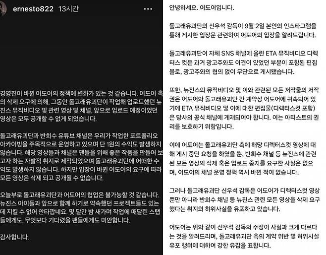 이에 대해 어도어는 9월 3일 SNS를 통해 공식 입장을 발표하며 신 감독의 주장을 반박했습니다. 어도어 측은 "돌고래유괴단이 자체 SNS 채널에 올린 ETA 뮤직비디오 디렉터스 컷은 과거 광고주와 이견이 있었던 부분이 포함된 편집물로, 광고주와의 협의 없이 무단으로 게시됐다"라고 밝혔습니다.