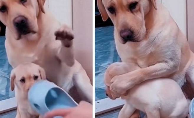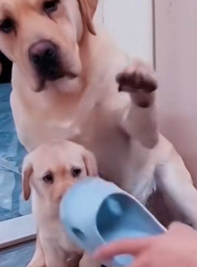 아기 강아지를 혼내려는 시늉을 하는 주인을 보자