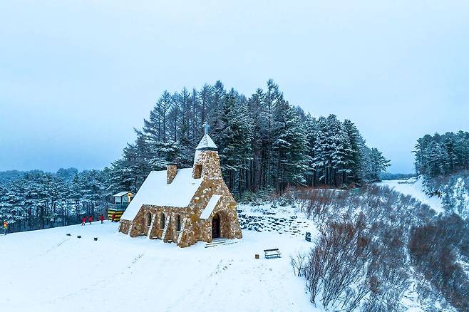 아담한 교회 건물과 그 주변에 펼쳐진 눈 덮인 들판, 그리고 고요하게 서 있는 소나무들은 방문객들에게 특별한 겨울 감성을 선사합니다.