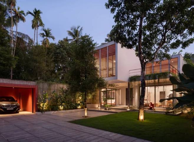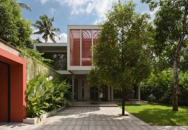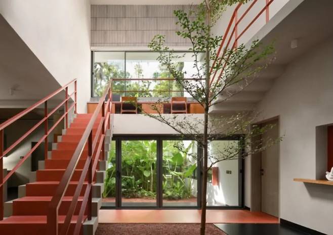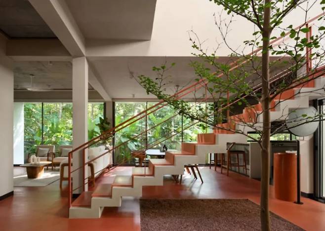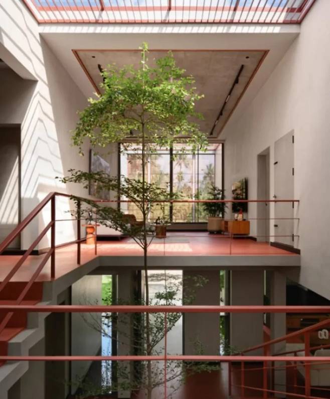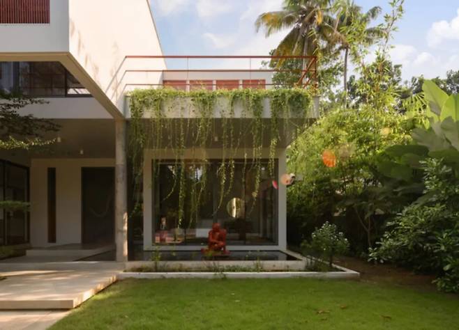 여러 그루의 육두구 나무와 망고 나무는 세심하게 보존되었으며, 현관 지붕 슬래브에는 구멍을 뚫어 나무들이 자유롭게 자랄 수 있도록 했습니다. 이는 자연에 순응하며 건축이 진행되는 강력한 상징적 표현입니다.