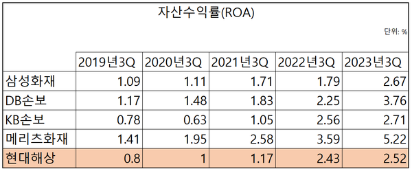 현대해상의 지난해 3분기 ROA는 2.52%로 가장 높았던 메리츠화재(5.22%)와 3%포인트 가까운 차이를 보였고 2%대인 삼성화재나 KB손보에 비해서도 낮았다.