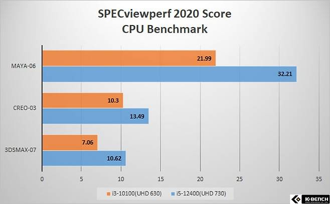 10세대 인텔 CPU에 탑재되었던 전세대 내장그래픽, 인텔 UHD 그래픽 630과 비교했을 경우, CPU 자체 성능 영향도 있겠지만 전체적으로 더 나아진 3D 작업 성능 결과를 받아볼 수 있었다.