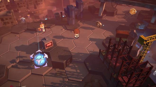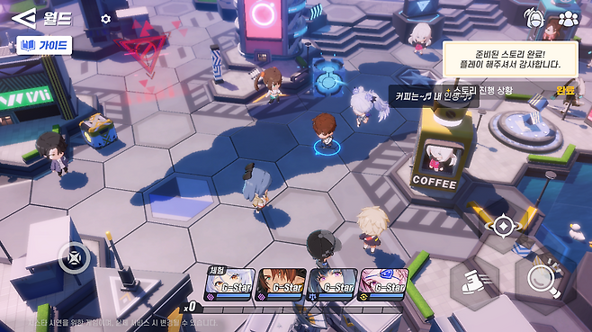 필드는 쿼터뷰 형식으로, 타일 형태로 이루어진 필드 이곳 저곳을 돌아다닐 수 있습니다. 시야각을 바꿀 수 없어서 귀여워 보이는 SD 캐릭터들의 머리 꼭지만 보이는 건 좀 아쉬웠지만, 뛰어다니는 모습 자체가 귀엽긴 합니다.