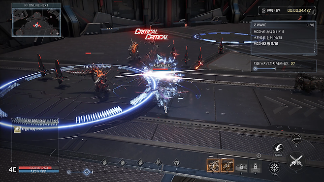 다만 전투에 진입한 순간 ‘RF 온라인 넥스트’의 매력이 조금 반감되는 느낌이었습니다. 아무래도 모바일 버전을 메인으로 했기 때문인지, 타겟팅이 마음대로 고정되어 액션이 자유롭지 못한 느낌을 받았거든요. 게다가 제가 선택한 ‘인포서’는 근접 캐릭터였기 떄문에, 갑자기 뒤를 돌아서 타겟팅 된 적을 향해 달려다가는 등 전투에 있어서 당황스러울 때가 많았습니다. 게다가 모바일 버전으로 진행할 때 오른손 엄지의 공격 버튼을 ‘E’ 버튼으로 적용하였기 때문에 ‘전투의 맛’을 즐기기가 어려웠습니다. 장르가 ‘모바일 MMORPG’란 것을, 자동 전투가 있다는 것을 나중에 꺠닫게 되었죠.