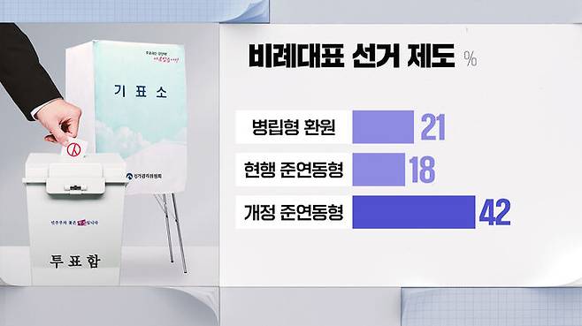 과거와 같이 지역구와 비례대표 의석을 분리해 뽑는 병립형 21%, 위성 정당 창당이 가능한 현행 준연동형 비례대표제 18%, 위성 정당 창당을 금지하도록 현행 준연동형 비례대표제를 개선하자는 의견이 42%로 가장 높았습니다.