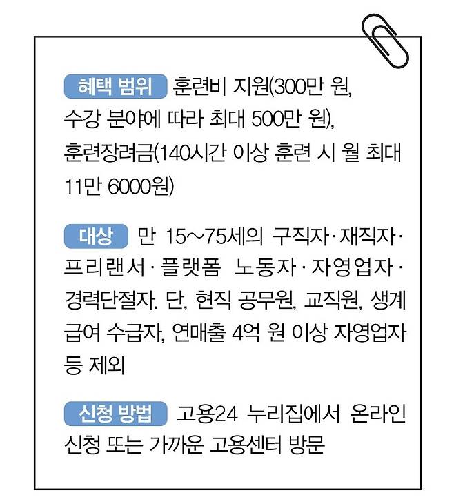 정부는 평생학습과 직업 전환이 자연스러운 사회를 만들기 위해 국민내일배움카드를 도입했습니다. ‘배움’에서 소외되는 사람이 없도록, 누구나 도전할 수 있는 기회를 가질 수 있도록 하기 위해서입니다. 교육비 걱정은 줄이고 가능성은 넓히고, 국민내일배움카드로 미래에 투자하는 습관을 만들어보시기 바랍니다. 더 자세한 정보는 고용24 누리집에서 ‘국민내일배움카드’를 검색해보시기 바랍니다.