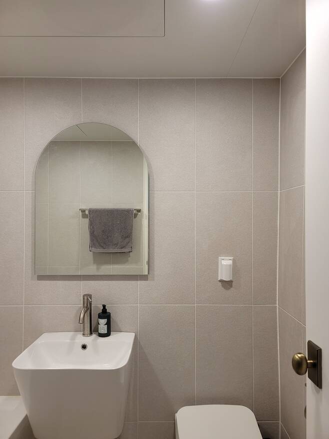 마지막으로 욕실입니다. 욕실은 정말 긴축해서 기본스타일로 진행했기 때문에 크게 보여드릴 것이 없네요! 거실 욕실은 샤워부스, 안방 욕실은 욕조를 설치했고 마감재는 동일하게 시공하였습니다.
