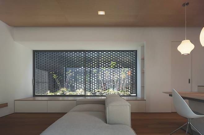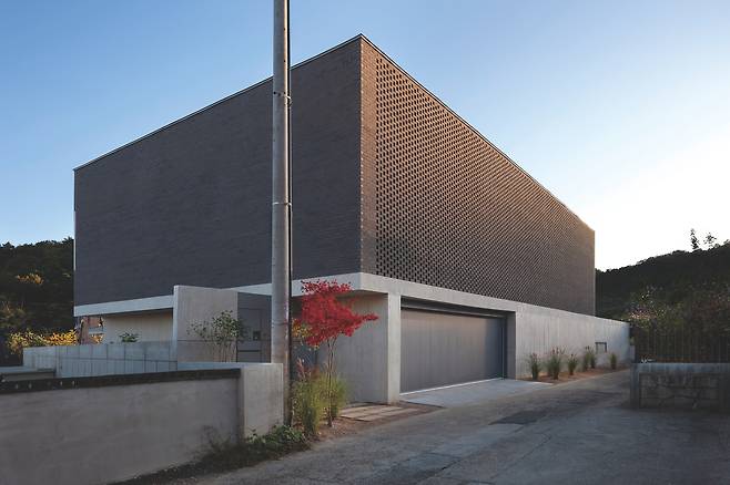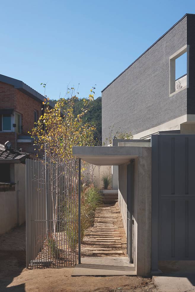 집은 인접한 주택들을 고려해 밖으로 열리기보다는 안으로 열린, 프라이버시가 확보된 내향적인 집으로 계획했다. 특히, 짙은 회색의 점토벽돌 영롱쌓기를 통해 바깥에서는 시선을 차단하고 안에서는 적당히 열린 방식이 되도록 했다.