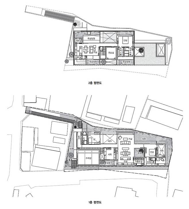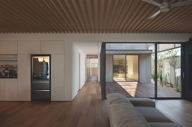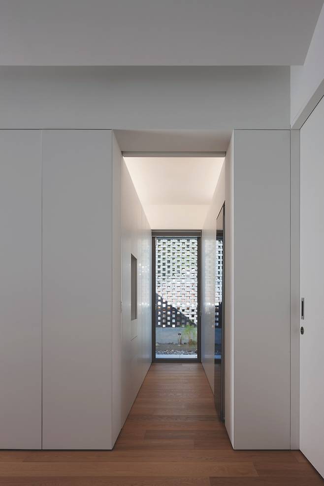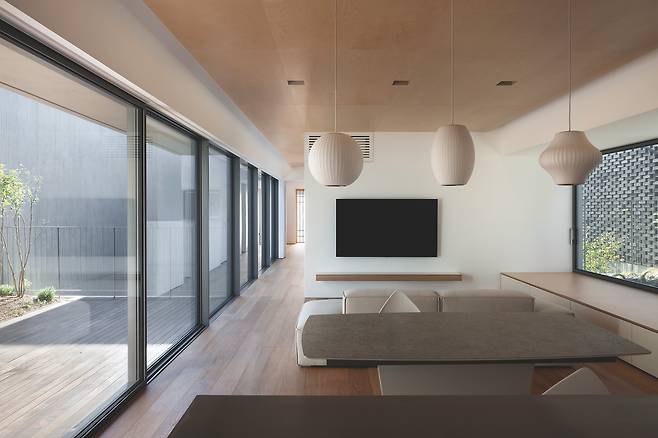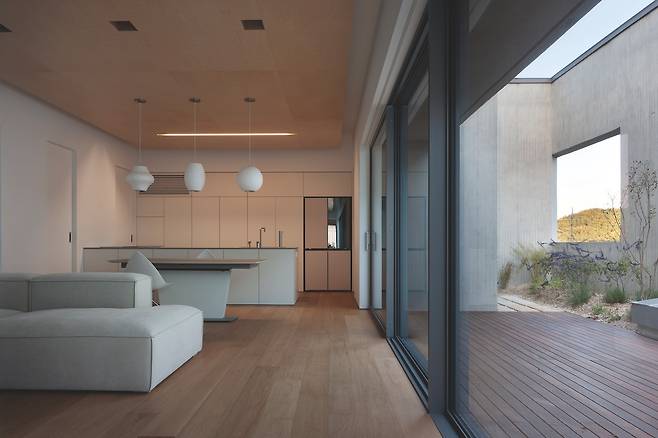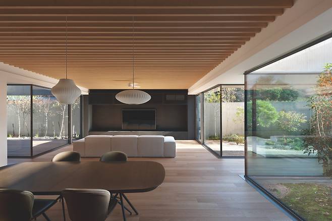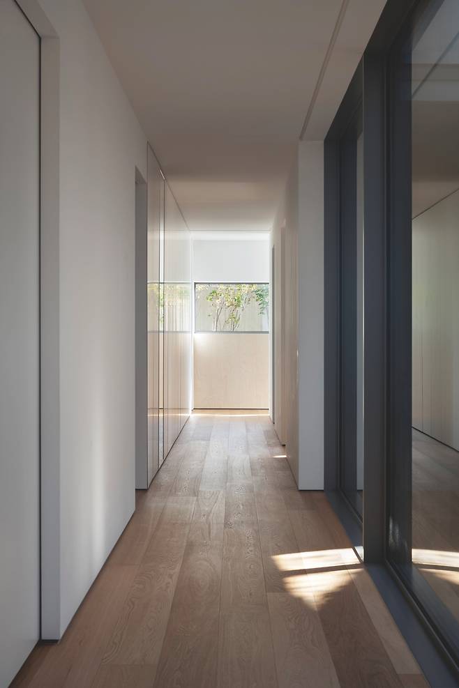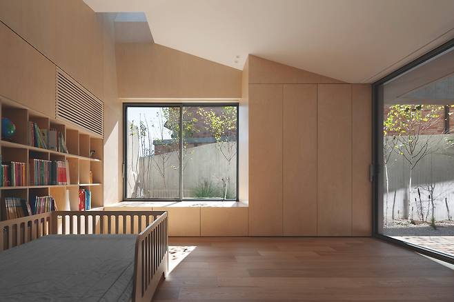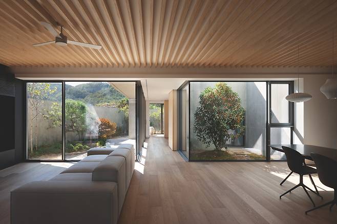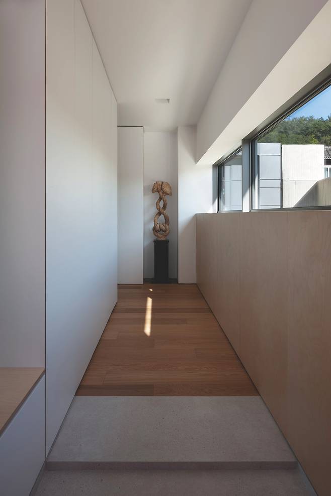 1층은 부모님 내외와 손자를 위한 공간으로, 2층은 아들 내외를 위한 공간으로 구성했다. 바깥에서 보이는 닫힌 분위기와는 다르게 실내에서는 바깥으로 열려 확장되는 공간의 분위기가 느껴지도록 했다. 긴 복도를 따라 펼쳐지는 내외부의 병치를 통해 안과 밖이 구분되지 않도록 했다.