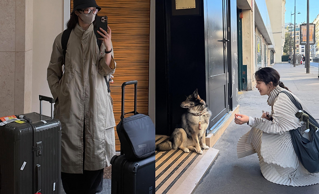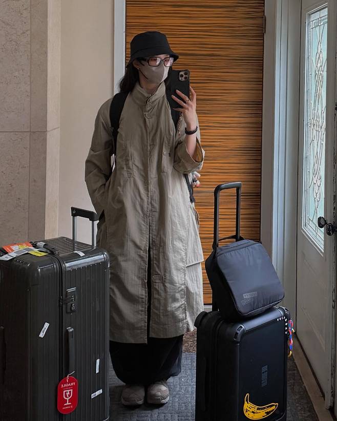 두 번째 사진에서 이청아는 넉넉한 핏의 라이트 베이지 롱코트에 버킷햇, 백팩을 매치해 편안한 여행자 스타일을 완성했다. 블랙 팬츠와 스니커즈로 실용성을 더했고, 캐리어에는 바나나 스티커 등으로 개성을 표현했다. 군더더기 없는 톤온톤 스타일링과 액세서리 활용이 돋보인다.