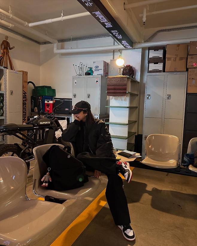 세 번째 사진에서는 올블랙에 가까운 캐주얼 스트리트룩을 선보인다. 오버핏 블루종 점퍼와 와이드 팬츠, 그리고 나이키 조던 스니커즈로 힙한 무드를 연출했다. 백팩에는 인형 키링 등으로 포인트를 주었고, 전체적으로 편안하면서도 스타일리시한 분위기가 느껴진다.