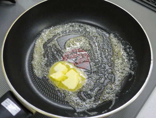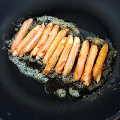 먼저 팬에 무염버터 1.5큰술을 약불에 녹인다. 버터가 녹기 시작하면 다진 마늘(1큰술)을 넣고 타지 않게 볶는다. 이때 마늘이 노릇하게 익기 전까지만 중약불 유지가 중요하다. 마늘이 갈색이 되면 향이 쓴맛으로 변하기 때문이다. 마늘향이 퍼지기 시작하면 크래미를 손으로 찢어 넣고 팬에 올린다.