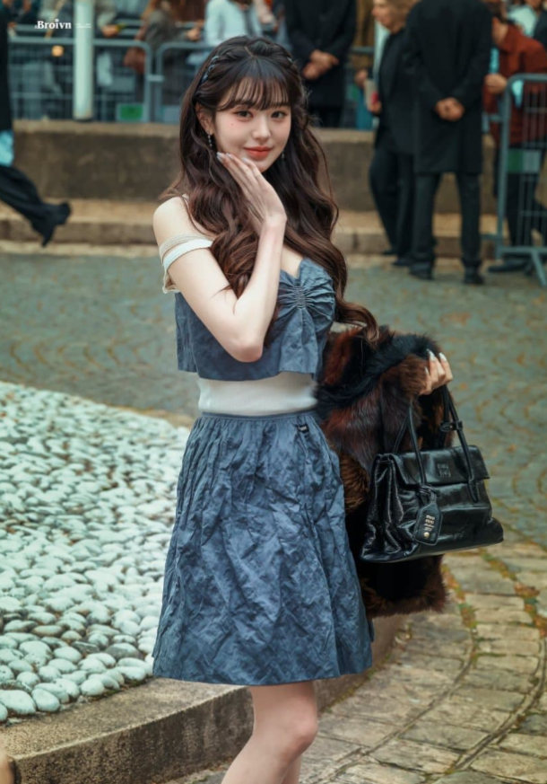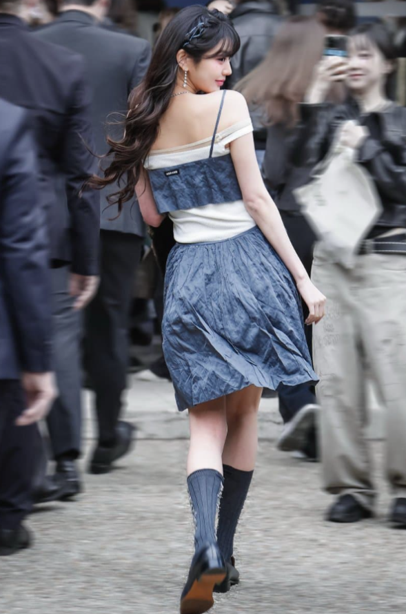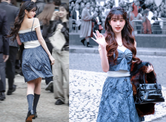 장원영 님이 이날 선택한 패션은 블루 컬러의 투피스 룩으로, 슬리브리스 톱과 미디 기장의 스커트로 구성된 세트였습니다. 특히 구김이 들어간 디자인이 자연스러움을 연출해주었는데, 부드럽고 흐르는 실루엣이 장원영 님의 여성스러운 매력을 강조했습니다. 미우미우의 자유롭고 로맨틱한 감성을 잘 살린 디자인이었죠.