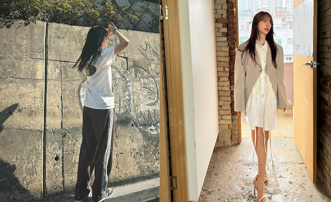 윤은혜는 화이트 크로셰 가디건과 데님 팬츠를 매치해 편안하면서도 세련된 캐주얼룩을 연출하고 있다. 크로셰 특유의 패턴과 블랙 라인 마감이 포인트가 되며, 하이웨이스트 데님 팬츠로 다리 라인을 강조한다. 자연스럽게 흐르는 웨이브 헤어가 전체적인 분위기를 한층 더 부드럽게 만든다.