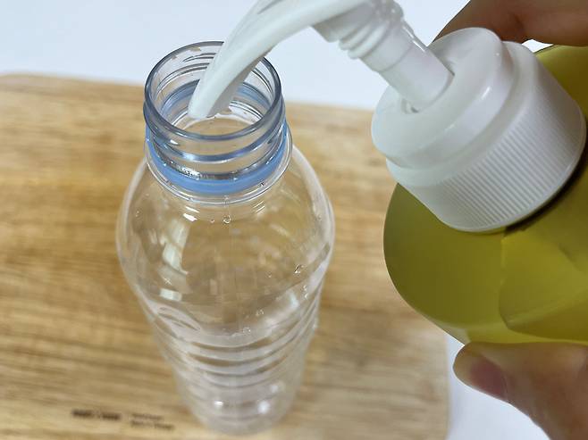 500ML 페트병에 샴푸를 소량 짜서 넣습니다. 그다음 물을 1/5 가량 채운 후 흔들어서 잘 섞어주세요. 다 쓴 샴푸통이 있다면 물을 소량 넣어서 흔들어주세요.