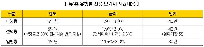 나눔형은 한도 5억원까지 40년 만기로 빌릴 수 있다. 연이율은 1.9%~3.0%로 부담이 적다. LTV는 최대 80% 적용을 받으며 DSR 적용은 받지 않는다.
