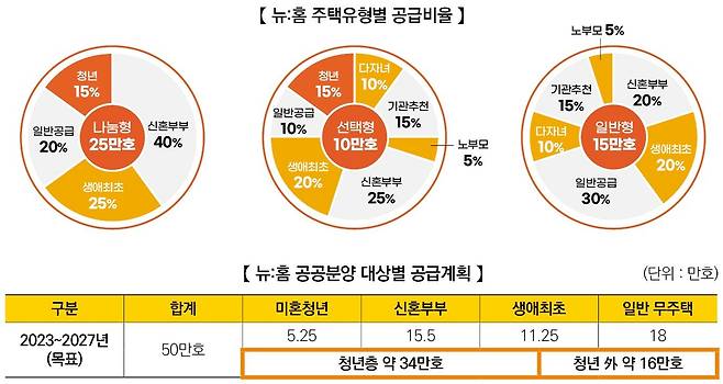 뉴:홈은 나눔형, 선택형, 일반형 등 3가지 유형이 있다. 나눔형 25만호, 선택형 10만호, 일반형 15만호가 향후 5년간 공급될 계획이다.