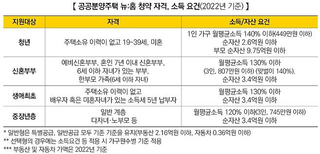 뉴:홈 청약자격은 세대를 구성하는 전원이 무주택이어야 한다. 신청자는 물론이고 배우자, 직계존속, 직계비속 등 주민등록표에 함께 등재된 모두가 무주택이어야 한다. 주택청약종합저축에도 가입되어 있어야 한다. 청년 특별공급의 경우 본인만 무주택이면 된다. 2022년 기준으로 소득과 자산요건도 충족해야 한다.