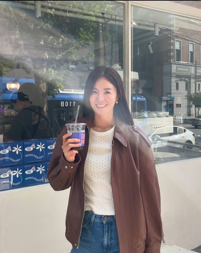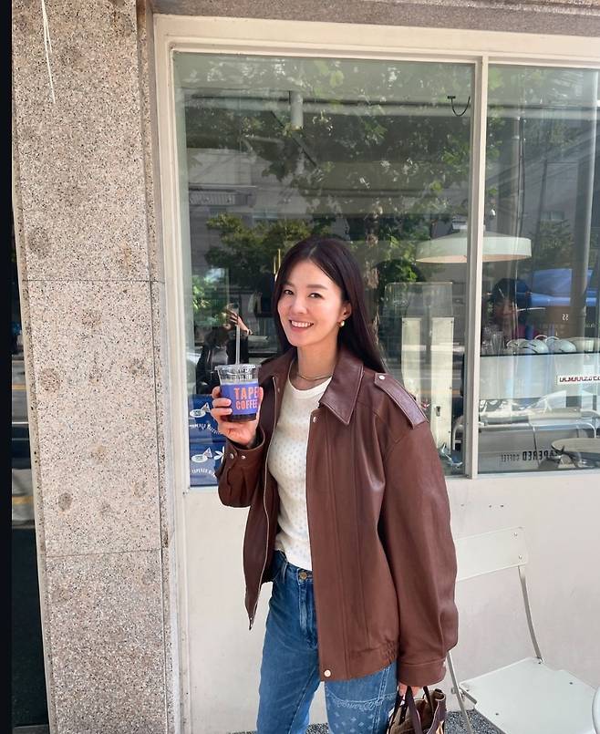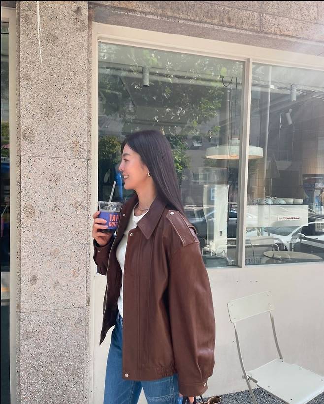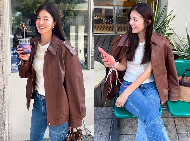 김성은은 화이트 반팔 티셔츠에 갈색 가죽 재킷을 걸쳐 시크하고 멋스러운 패션을 선보였습니다.
