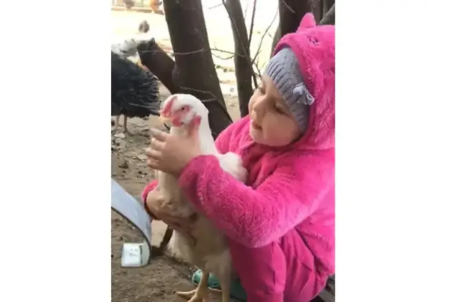 영상은 한 가정에서 촬영됐으며, 소녀의 시선이 닭 한 마리에 고정되는 장면으로 시작됩니다. 소녀는 닭의 등 뒤로 조심스럽게 다가가 두 팔로 몸통을 천천히 감쌌습니다.