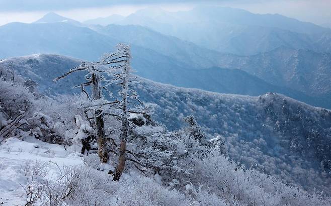 정상부 능선을 따라 이어진 눈꽃은 국내에서 보기 드문 스케일을 가지고 있고, 구름이 낮게 끼는 날에는 마치 풍경 전체가 떠다니는 듯한 느낌을 줍니다.