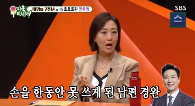 이어 장윤정은 도경완의 병수발을 들고 있는 근황을 전했는데요. 장윤정은 "남편이 손끝에 염증이 나서 병원에 갔는데 큰 병원을 가라고 하더라. 조직을 거의 다 뜯어냈다. 수술을 마쳤는데 감염이 됐다. 손을 못 쓰니까 생활이 너무 어려운 거다. 힘도 못 쓰고 물도 안 닿아야 하고. 아무것도 못하게 되더라"라고 설명했습니다.