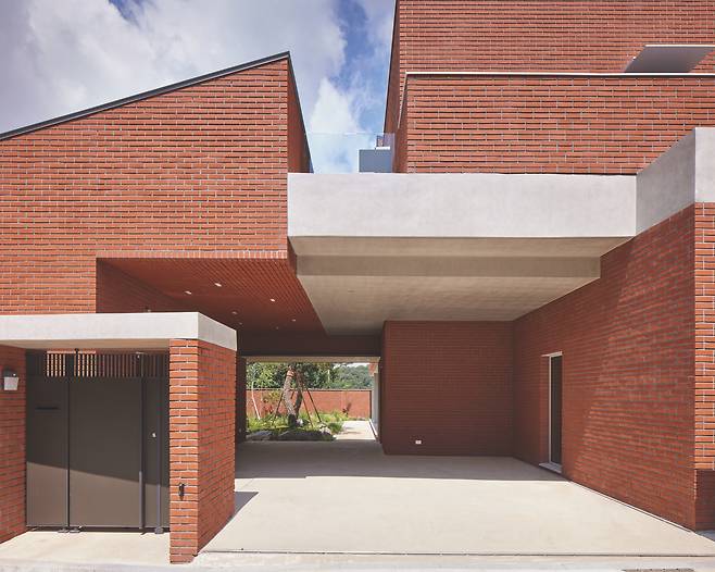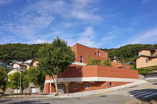 해당 대지를 포함한 주택단지 내 건물들은 대부분 벽돌로 지어졌고, 하나의 볼륨보다는 분절된 볼륨과 지붕의 형태로 이루어져 있다. 따라서 마을의 특징적 요소들을 활용해 주변의 맥락과 어우러지고 요구사항에 의해 커진 볼륨에 대한 과제를 해결할 수 있다고 판단했다. 큰 볼륨을 작은 볼륨들로 나누고, 3층을 2층에서 살짝 띄웠으며, 3개로 나누어진 지붕의 방향을 다시 서로 다르게 했다. 보편적인 단일 재료에 따른 큰 덩어리감은 콘크리트 슬래브 띠로 층을 나누어 구분했고, 벽돌을 쌓는 방식도 3가지로 다채롭게 구성했다.