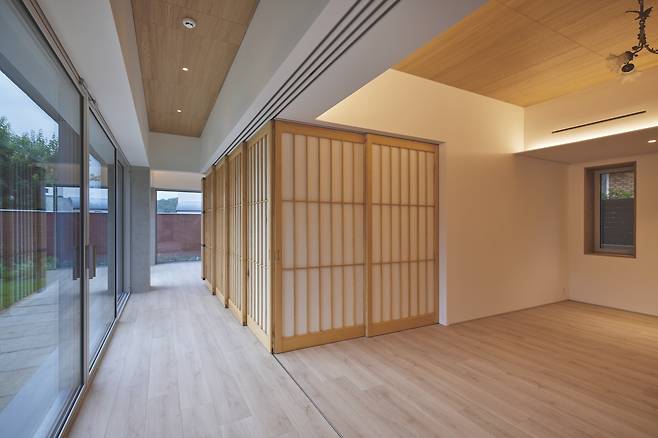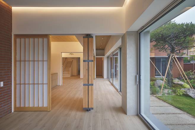디자인 요소만큼이나 이 집에서 중요한 점은 시각적 개방감과 사생활 보호의 공존이었다. 건축주 가족은 아웃도어 생활을 즐기는 타입으로, 어디서든 외부로 나갈 수 있는 공간이 마련되는 동시에 사적인 공간은 확실하게 구분되기를 원했다. 가족 공용공간인 1층은 실을 가변적으로 나눌 수 있도록 벽 대신 창으로 구획했다. 그래서 모든 창이 열렸을 때에는 외부 정원까지 시원하게 개방될 수 있다.
