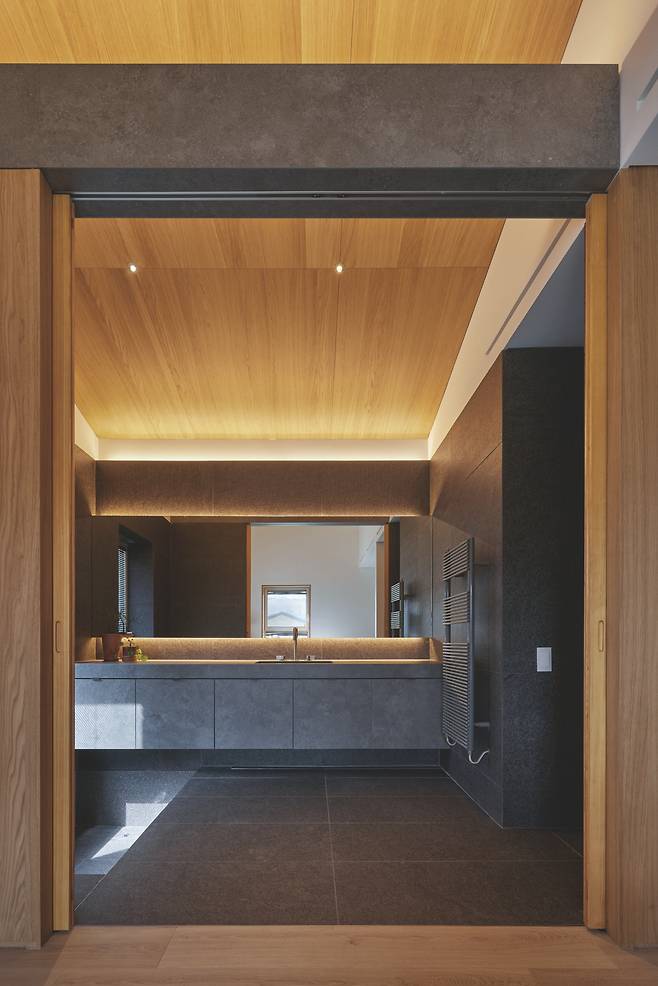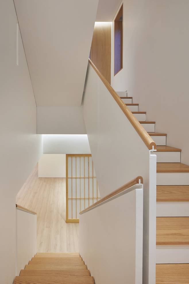 사적 공간인 2층부터는 구성이 사뭇 다르다. 내부는 노출을 줄이기 위해 창을 최소화했고, 대부분의 창은 테라스 난간 높이에 가려져 외부에서 잘 보이지 않는다. 하지만 모든 방에서는 개별 테라스가 계획돼 어디서든 나갈 수 있고 충분한 외부 개방감을 느낄 수 있도록 했다. 복도 공간 또한 외부에 노출되는 창 없이 환기와 채광이 가능하도록 중정을 계획했다.
