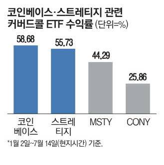 하지만 코인베이스에 투자하면서 커버드콜 전략으로 고배당을 추구하는 '일드맥스 코인 옵션 인컴 전략'(CONY) ETF의 토털 리턴 기준 수익률은 25.86%에 불과했다. CONY 주가는 올 들어 25.15% 하락한 상태다. 지난 1년간 연간 배당 수익률이 129.73%에 달하지만, 상승장에서 주가 수익률을 반영하지 못한 셈이다.