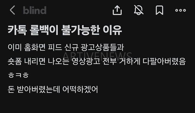 해당 블라인드 유저는 "이미 홈 화면 피드 신규 광고 상품들과 숏폼 내리면 나오는 영상 광고 모두 팔았다. 돈을 받아서 다시 되돌리기 어려울 것 같다"라고 예상했습니다.