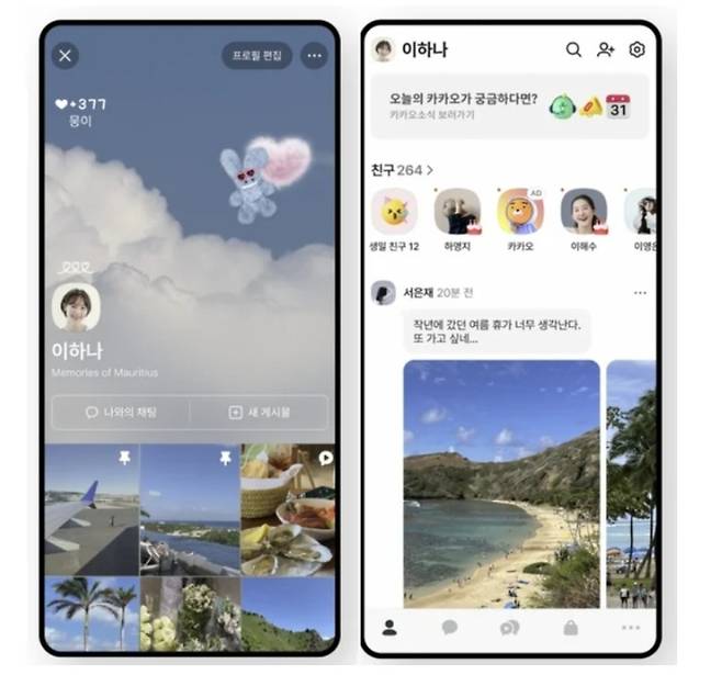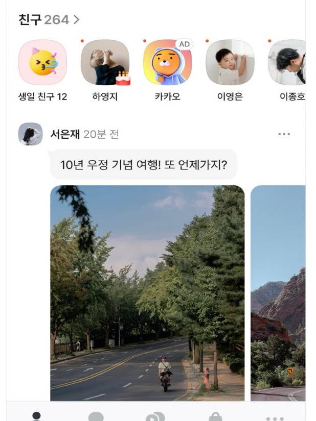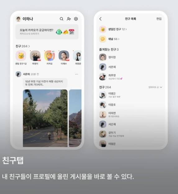 우선 인스타그램이나 카카오스토리처럼 SNS의 형태처럼 카톡의 친구 프로필 피드가 개편됐습니다. 기존에는 작은 프사와 친구 목록이 깔끔하게 보였다면 이제는 인스타 피드처럼 추가된 친구가 올리는 게시글을 크게 보게끔 바뀐 것인데요. 인스타그램처럼 친구들이 올린 사진이나 영상 등 콘텐츠를 피드 형태로 보여주는 구조로 바뀐 것입니다.