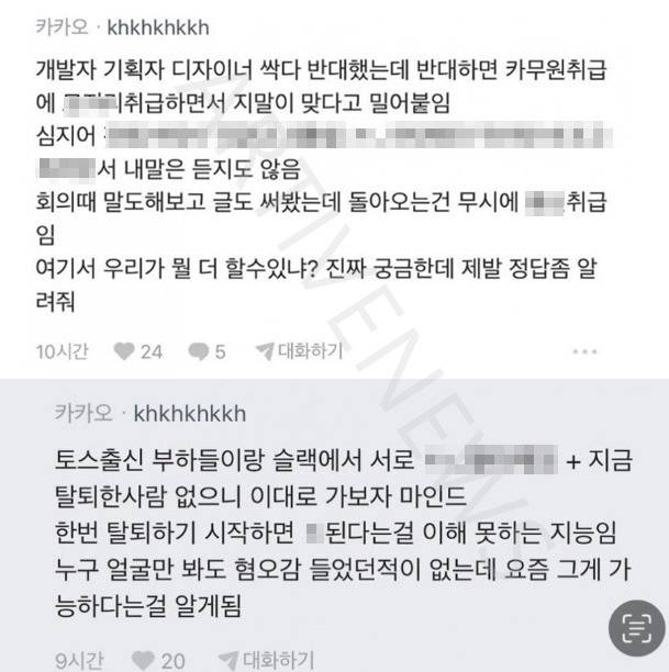 그러면서 블라인드에는 현재 회사 내부 분위기도 전해졌습니다. 실제 카카오에 재직 중인 직원 A 씨는 블라인드에 글을 올려 "개발자, 기획자, 디자이너 싹 다 반대했다. 반대하면 이상한 취급하면서 자기 말이 맞다고 밀어붙였다"라고 말하면서 회사 내에 기존 직원들과 토스 출신 사람들 사이에 긴장 관계까 있다는 식으로 주장했습니다. 그러면서 그는 "지금 탈퇴한 사람이 없으니 이대로 가보자는 마인드다. 한번 탈퇴하기 시작하면 큰일난다는 것을 모른다"라고 덧붙였습니다.