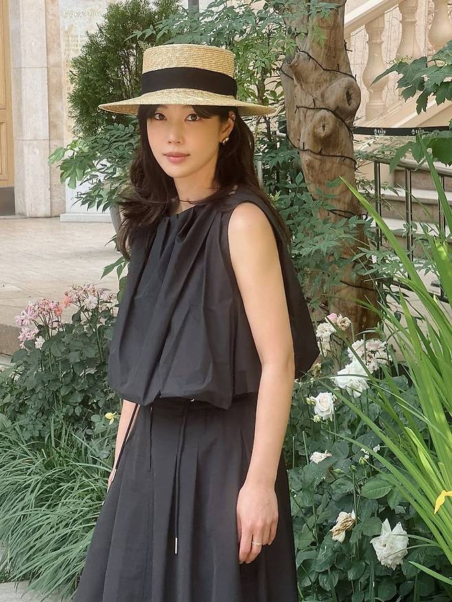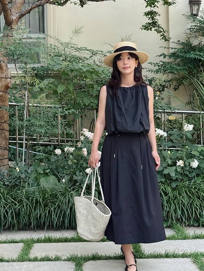 기은세처럼 여름 정원이나 리조트 분위기에 어울리는 룩을 시도하고 싶다면, 소재와 실루엣에 집중하는 것이 포인트다. 통기성 좋은 코튼이나 린넨 블렌드 원피스를 기본으로, 라운드 보터햇이나 라피아 백을 함께 매치하면 근사한 여름룩이 완성된다. 특히 어두운 컬러의 원피스도 충분히 계절감을 살릴 수 있다는 점에서, 블랙의 재발견이라 할 만하다.
