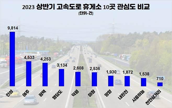 데이터앤리서치는 지난 1월부터 6월까지 국내 고속도로 주요 휴게소 10곳의 상반기 관심도(정보량=전체 포스팅 수)를 빅데이터 분석했다.