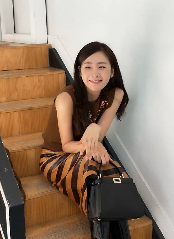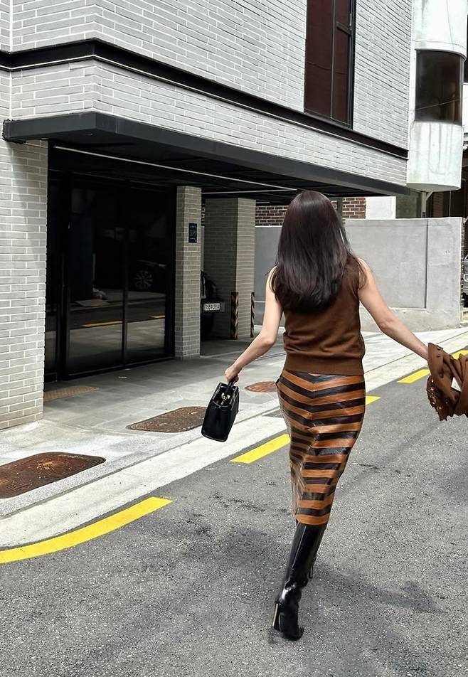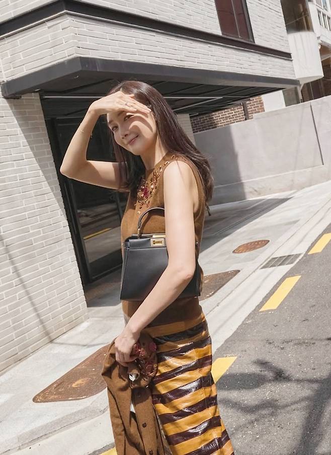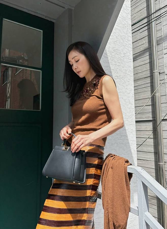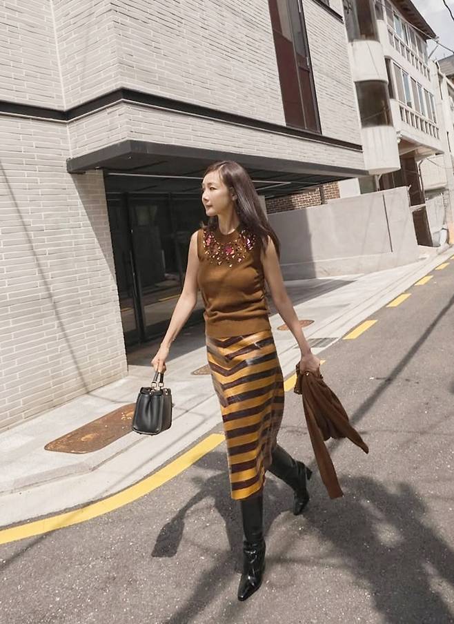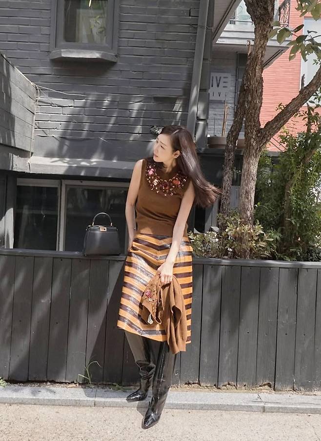 공개한 사진에서 최지우는 플라워 자수가 포인트로 장식된 슬리브리스 니트 톱에 브라운&머스터드 옐로우 스트라이프 패턴의 레더 미디 스커트를 매치해 우아한 가을 무드를 완성했다.