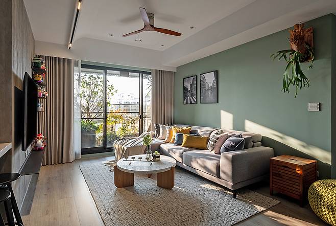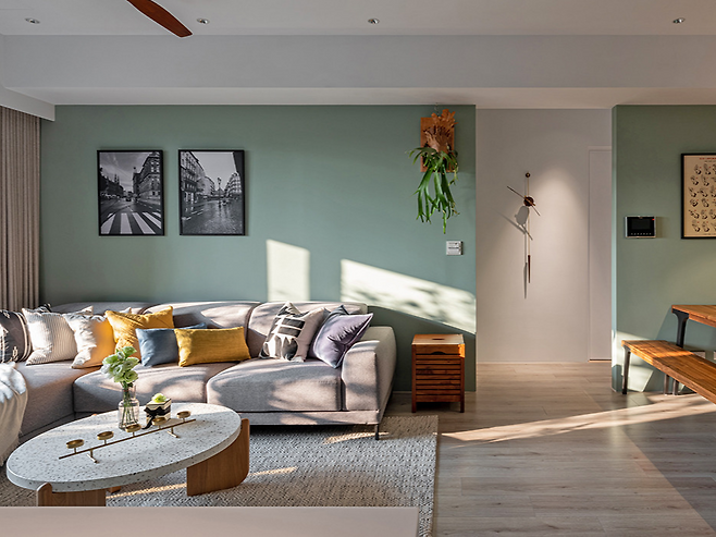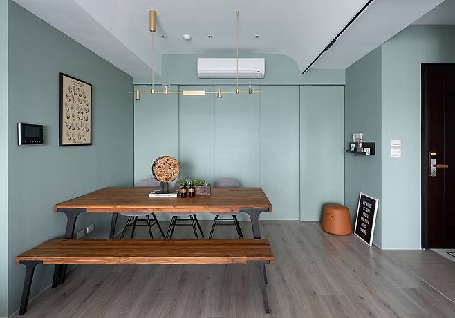 그 옆으로 연결되는 다이닝 공간은 은은한 회색과 초록빛이 부드럽게 융화됩니다. 긴 식탁이 자리 잡은 이곳은 때론 가족이 모이고, 때론 디자이너의 작업공간으로 변신합니다. 무엇보다 복잡한 선 없이 부드러운 곡선을 담아, 시각적으로도 마음이 시원해지는 곳입니다.