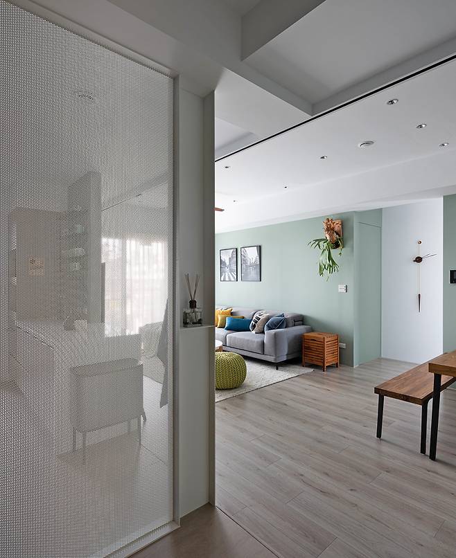 현관부터 디자이너의 고민이 느껴집니다. 천공된 패널과 거울 캐비닛은 시야를 걸러내며 빛을 실어 나릅니다. 마치 숲 사이사이로 떨어지는 햇살 같달까요. 신발장과 옷장의 위치, 높이까지도 먼지 유입을 막는 전략이 숨어있습니다.