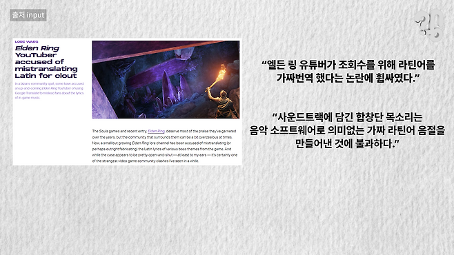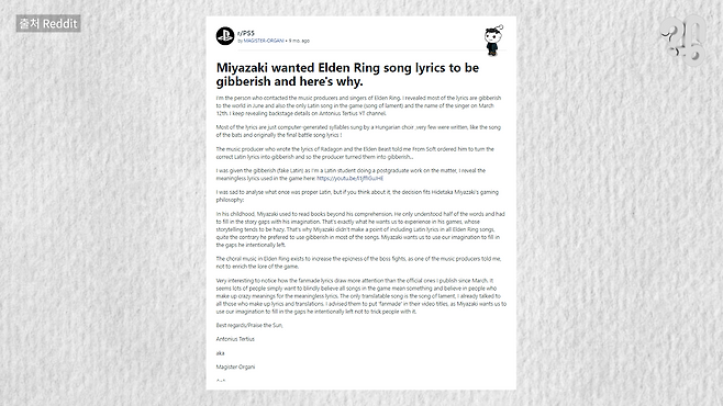 게임음악에 어떤 라틴어 가사가 들어가는지는 해외에서도 화제가 된 적이 있다. 지난해 출시됐음에도 이미 ‘역대급’ 명작으로 평가받는 ‘엘든 링(Elden Ring)’이 대표적이다.