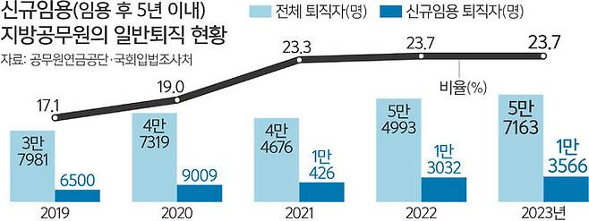 5일 국회입법조사처와 공무원연금공단에 따르면 최근 5년간 전체 지방공무원 퇴직에서 신규임용 공무원이 차지하는 비율은 2019년 17.1%에서 2023년 23.7%까지 지속해서 증가한 것으로 나타났다.