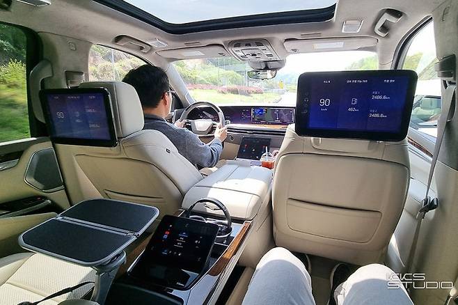 ESV 모델의 핵심은 뒷좌석입니다. VIP 고객을 위한 제품인 만큼 2열 이그젝큐티브 시트 패키지가 기본으로 제공됩니다. 2열 전동 좌석은 14방향으로 조절 가능하며, 열선, 통풍, 마사지, 럼버 서포트 기능을 지원합니다. 센터 콘솔에는 전용 커맨드 센터, 듀얼 스마트폰 무선 충전, 접이식 트레이 테이블이 내장되어 있습니다. LED 앰비언트 라이트는 주행 모드나 탑승자 취향에 따라 유기적으로 반응하며, 126가지 색상을 지원하고 1열과 2열 공간의 색상을 다르게 설정할 수도 있습니다. AKG 스튜디오 레퍼런스 오디오는 4개의 스피커가 2열 좌석 헤드레스트에도 배치되어 총 40개의 스피커로 풍부한 음향을 제공합니다. 좌석별로 음향을 설정할 수 있으며, 앞좌석 헤드레스트 뒤쪽의 12.6인치 디스플레이와 연동할 수도 있습니다.